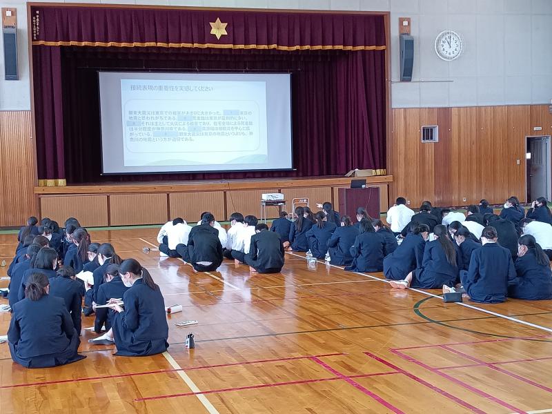 講演後の質疑応答では、「私たちが能登の発展にできることはありますか?」という質問があり、それに対して「私たちが住み続けながら考えることが大事である。是非外へ出て知識を吸収し、それを能登のために活かしてください。」とお答えいただきました。1年生は今日の学びをこれからの探究活動に活かして下さい。