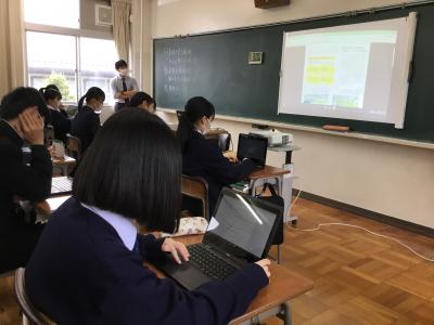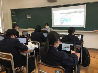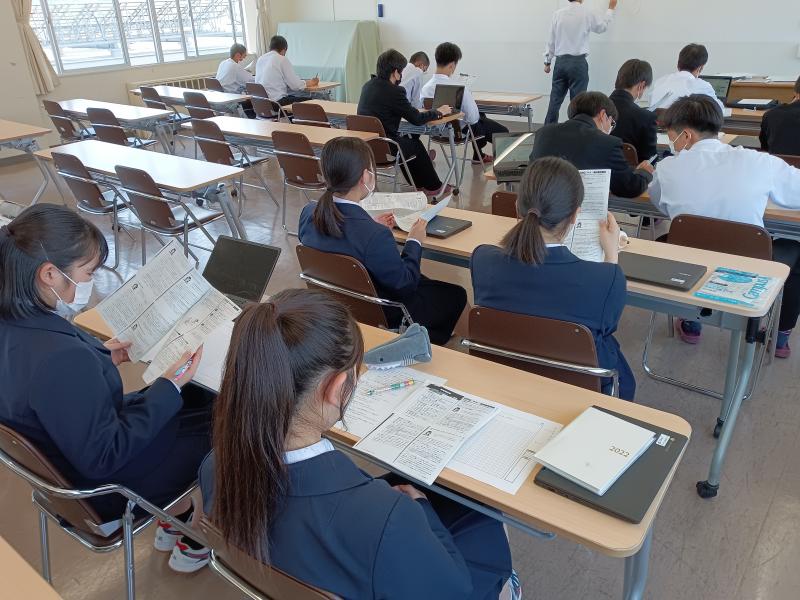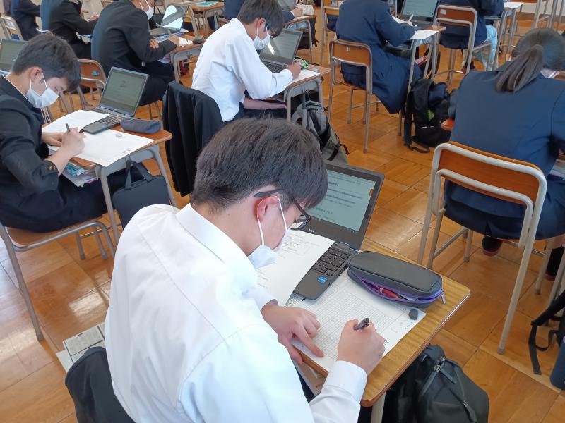 自分が行きたいと考えている大学、短大、専門学校、就職先(公務員を含む)を一人一台端末のクロムブックを使って調べました。複数の学校を調べ、比較し情報を交換している生徒もいました。なかには、クロムブックのアプリ、ロイロノートで大学受験の過去問をまとめている生徒も見られました。”自分のしたいことは何なのか”を考え、家族の方とも話しているそうです。
