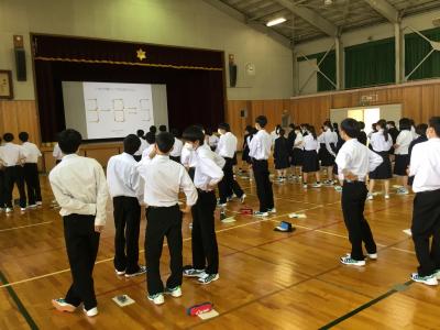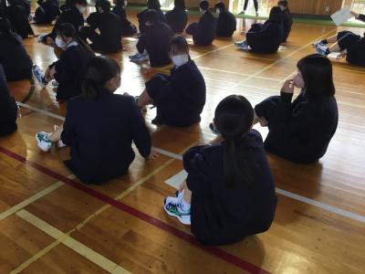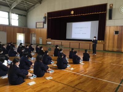 1年生の学年集会を行い、スクールカウンセラーの屶網先生から「学校生活を楽しく送るために」というテーマで、他人との関わり方についてお話をしていただきました。