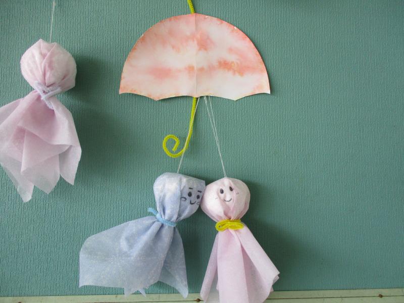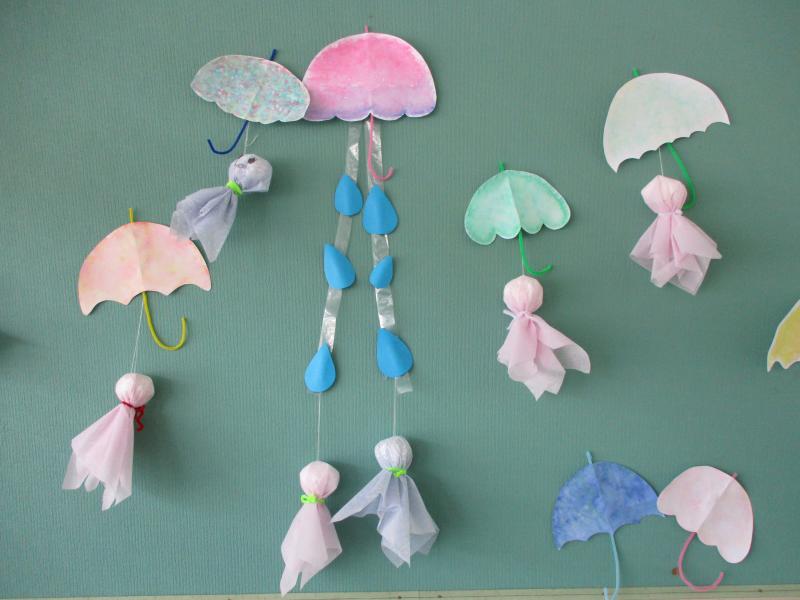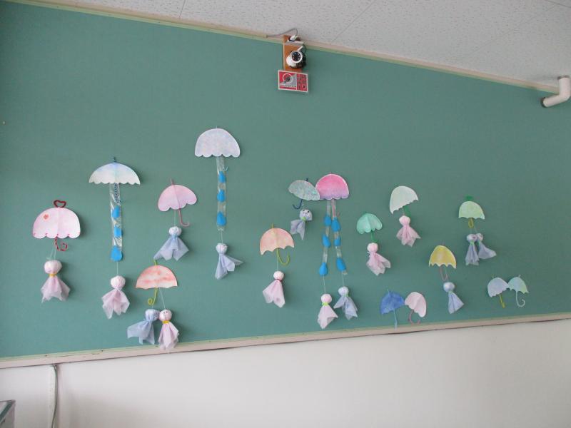 3年生の選択科目「子どもの発達と保育」で壁面飾り製作をしました。今回のテーマは「梅雨」。