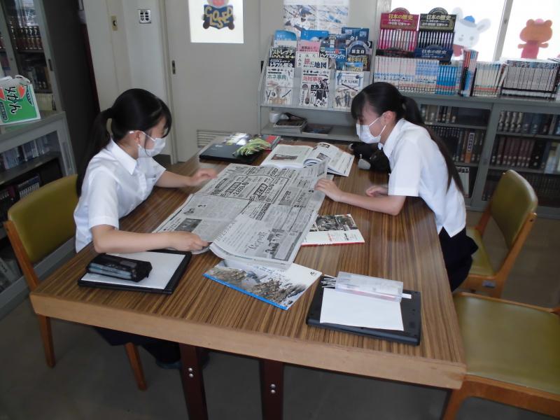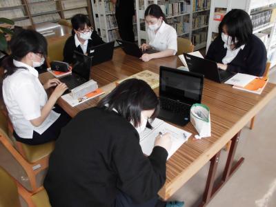 また、活動場所も教室を飛び出して、図書館で本や新聞といった資料を用いて情報収集をしたり、廊下に掲示されている現2年生の探究活動の成果物を見たり、クロームブックでネット検索をしたりなどとそれぞれ自由に活動を行いました。