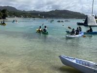 湾に帰ってくると、カヌー部隊が出迎え(?)です。