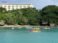 はじめはおぼつかないバドル操作でしたが、少しずつ慣れて来るとみんなで少し岸から離れ、思い思いのペースでカヌーを楽しみました。(上に見えているのが、宿泊しているホテルです。)