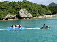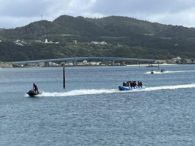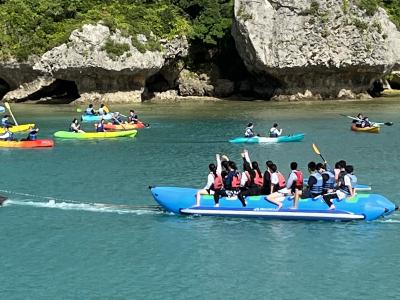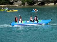 強風のため、マリン体験の一つが中止になりましたが、代わりにバナナボートに2回乗車することになりました。