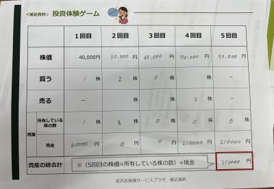契約や投資とはどういものなのかについて楽しく学ぶことができました。投資体験ゲームでは、ここで株を売るべきか、取っておくべきか、それとも買った方がいいのか、真剣に悩み、考えていました。