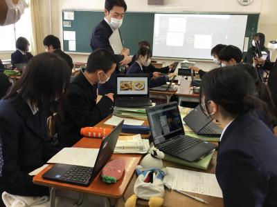 1人1台端末を活用した主体的・対話的で深い学びの実現に向けて授業研究に取り組んでおります。生徒は与えられた課題について、情報を収集し、簡潔にまとめ、相手にわかりやすく伝えられるよう工夫しています。