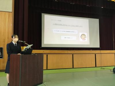 4月より個人で進めてきた活動のまとめとなる発表を各会場に分かれて行い、その中から代表に選ばれた7人が学年全体の前で発表しました。