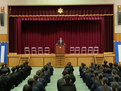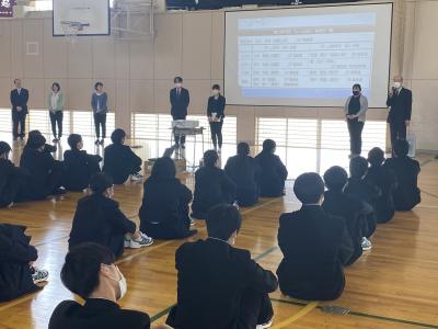 今年度は、進路実現や人間性の成長のために、「成長」していく一年となります。3年生全員が一丸となって、最後まで頑張り続けることの大切さのお話がありました。