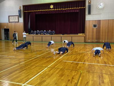 上級生が1年生に、体操やトレーニングの順序、授業での心構え等を指導しています。