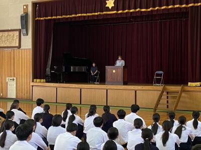 スライドを使った杉澤校長からの訓話では、スマートフォンが脳に及ぼす影響と学習時間や学力との関連について触れられました。生徒課からは夏休みの過ごし方や、健康で安全に2学期を迎えるためのお話がされました。