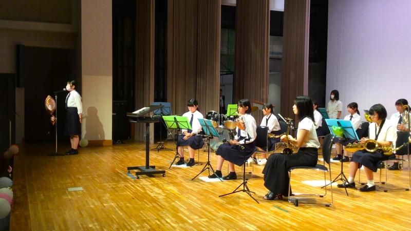 創立50周年を迎える本校の校歌から始まり、流行曲や、来てくださった方が懐かしいと感じていただけそうなメドレー曲、吹奏楽の定番曲を演奏しました。