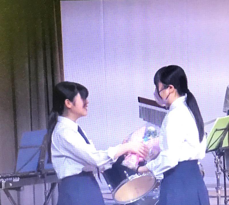 今月をもって2人の教職員が離任することになりました。生徒に向けてご挨拶をいただき、生徒を代表して生徒会会長の領家さんと副会長の加賀さんから花束を贈呈しました。