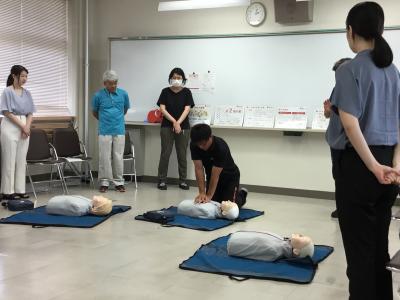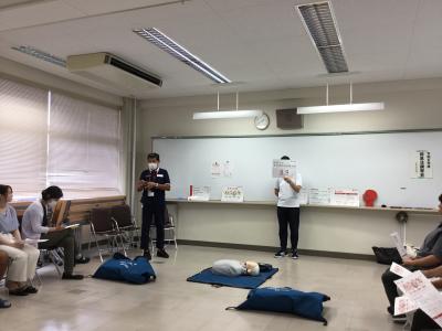 前半は救命の連鎖について講習を受け、後半は、胸骨圧迫やAEDを使った演習を行いました。万が一の際に、自分ができることを確認するいい機会となりました。