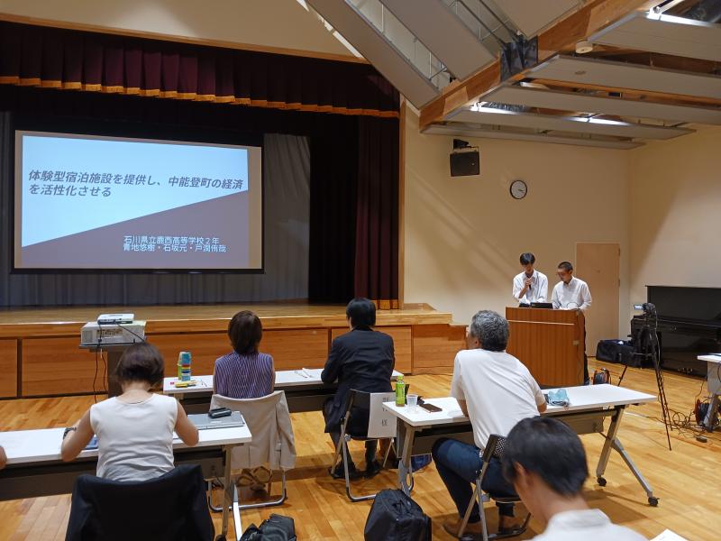 8月4日(金) に能登町のコンセールのとで「企業と連携したアントレプレナーシップ教育推進事業」の各校事業計画の発表会が行われました。企業経営者や団体役員を前に本校代表の2名は「体験型宿泊施設を提供し、中能登町の経済を活性化させる」というテーマで発表し、審査員からの質問にも的確に回答しました。