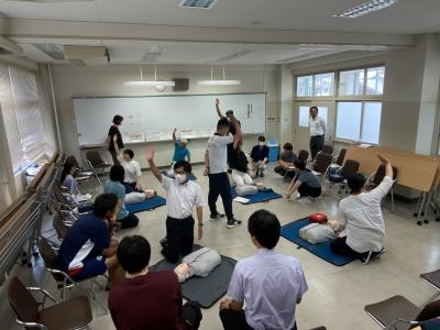 前半は救命の連鎖について講習を受け、後半は、胸骨圧迫やAEDを使った演習を行いました。万が一の際に、自分ができることを確認するいい機会となりました。