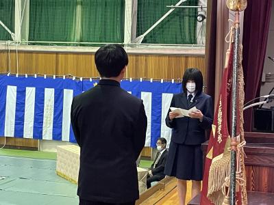 在校生から卒業生へ記念品の贈呈:在校生代表 今田和心さん、卒業生代表 船山知希さん