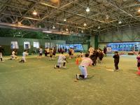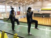 ノックの様子です。左右のネットぎわにシャトルが来たときの練習です。コートの真ん中からのフットワークやラケットの使い方の練習です。初心者が多く、経験者に教えてもらいながら練習しています。すぐにはうまくできませんが、繰り返し練習して上達を目指します!