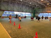 ノックの様子です。左右のネットぎわにシャトルが来たときの練習です。コートの真ん中からのフットワークやラケットの使い方の練習です。初心者が多く、経験者に教えてもらいながら練習しています。すぐにはうまくできませんが、繰り返し練習して上達を目指します!