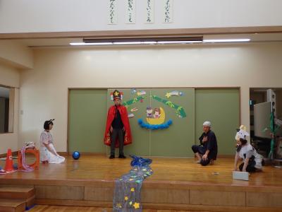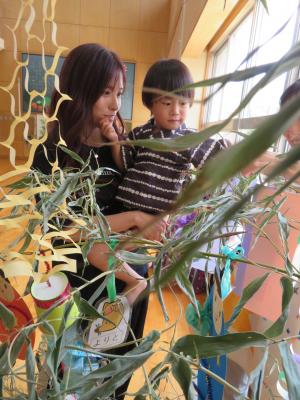 親子で作った七夕飾りや短冊を飾り、七夕の劇を見ました。
