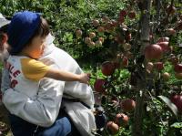 2歳児のお子さんは、ママやパパと一緒にりんご狩りに行ってきました。りんご園には、赤とんぼもたくさんいて、秋を感じることができました。赤いおいしそうなりんごをよく見たり触ったりしていました。初めての校外行事でしたが、とても楽しんでいる様子でした。