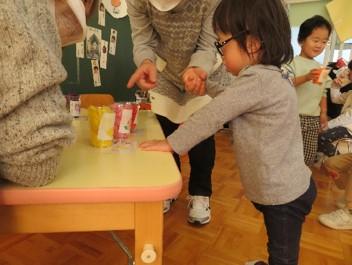 11月28日(木)幼稚部のお店屋さんごっこに、2歳児さんが参加しました。子どもたちは、楽しみでわくわくしている表情やいつもと違う雰囲気にドキドキしている様子もありましたが、その気持ちも親子で伝え合いながら買い物を楽しみました。