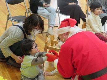 12月21日(水)2歳児さんが幼稚部のクリスマス会に参加しました。サンタさんからプレゼントをもらったり、幼稚部のお友達の出し物をよく見たり、一緒にダンスを楽しみました。