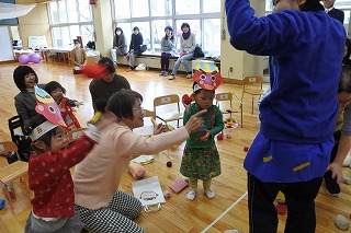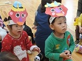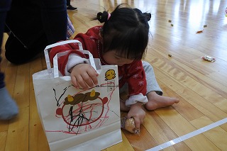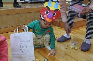 2歳児さん3名は、自分たちが作った鬼のお面とお菓子を入れる