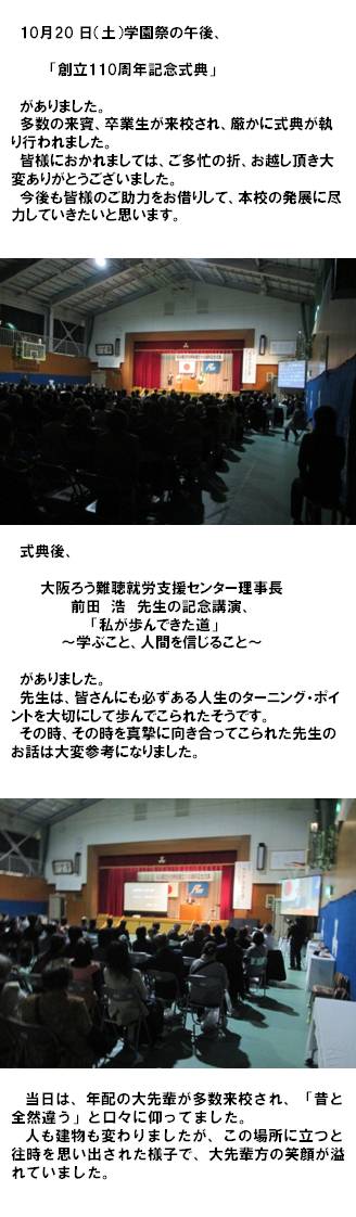 今年度は午後に110周年記念式典が行われるため、学園祭は午前中の表現会のみになります。