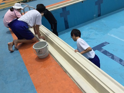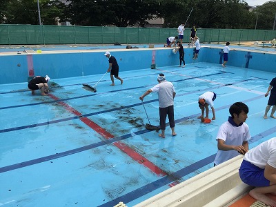 6月18日(月)全校でプール掃除をしました。中学部の生徒は、デッキブラシや、亀の子たわしを使ってプールの掃除をしました。