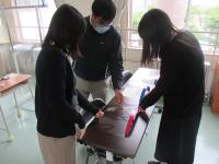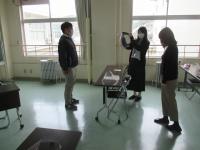 5月20日(水)・21日(木)視聴覚室で先生方がオリジナルで製作したフェイスシールドや市販のフェイスシールドの展示会を行いました。担当する幼児児童生徒に合うタイプがどれか、先生方自身が授業等で使いやすいタイプはどれか、また、実際に着用しながらアイデアを出し合い、よりよいものを探っています。