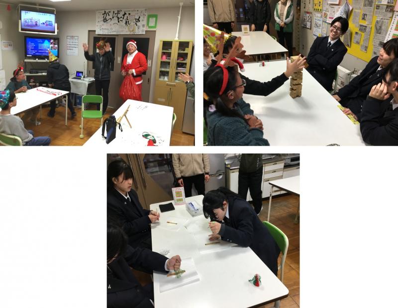 12月16日(火)寄宿舎のクリスマス会がありました。今年は、体験入舎生も加わって、寄宿舎食堂でジェンガ、白ひげサンタ危機一髪ゲームとポッキーツリー作りを楽しみました。校長先生のサンタ、小学部部主事のトナカイ登場に舎生たちは、笑顔が溢れていました。夕食は、クリスマスメニューでりんごのガトーインビジブル、自分で作ったポッキーツリーを美味しく頂きました。