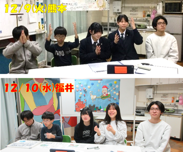12月9日(火)と12月10日(水)、2日連続で他県のろう学校とオンライン交流を実施しました。1日目は昨年度から引き続きオンライン交流している熊本聾と行い、先日NHKで放送された手話パフォーマンス甲子園を取り上げたTV番組についての感想や今年のオンライン交流の振り返りをしました。手話パフォーマンス甲子園の優勝校である熊本の舎生から貴重なアドバイスを貰い、とても有意義な時間になりました。