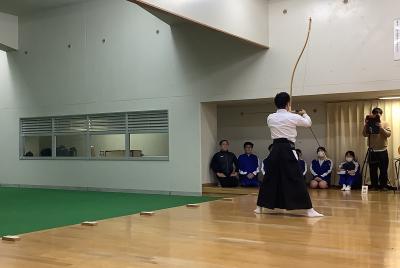 11月28日(金)から高等部生が、毎年楽しみにしている弓道の授業が始まりました。高等部では、毎年この時期に集中して弓道の授業を行っています。昨年度までは、兼六弓道場をお借りして行っていましたが、今年度からお隣の金沢錦丘高校の弓道場で行うことになりました。歩いて5分の場所にあるため、より集中して弓道に取り組むことができるようになりました。初回は、世界チャンピオンで金沢錦丘高校教諭の友安先生による模範演技が披露され、凛としたたたずまいと見事に的を射抜く姿を間近で拝見し、自然とみんなの背筋も伸びました。