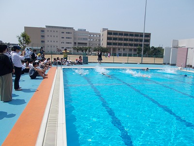 6月25日(月)のプール開きでは、お神酒、お塩でプール安全を祈願したあと、中学部、中田さん、梅野君、潟見君、高等部 山本凪紗さん、中川君が初泳ぎをしてくれました。
