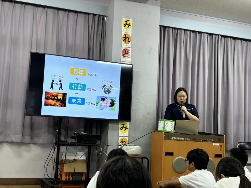 月星製作所の方を招いて、5年生がSDGsについて学びました。ボードゲームを通して、「再生できないものは…」「持続可能なものにするには…」など様々に考えながらチャレンジしました。みんなの力を合わせることや資源や燃料がなくならないようしていくことが大事だということをゲームの中で、実感していたようです。