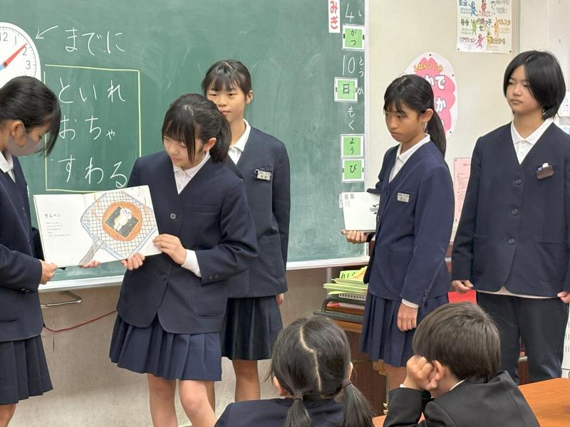 毎朝、6年生が1年生の教室に行って朝の準備のお手伝いや、読み聞かせをしてくれています。とっても温かくていい時間です。