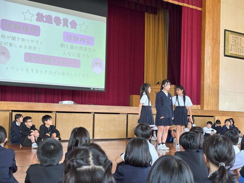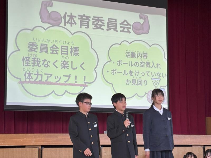 自分たちで考えた活動のめあてや活動内容をしっかりとみんなに伝えることができました。一人一人の頑張りが楽しい学校につながります。どの委員会にもみんなのために縁の下の力持ちになって取り組む活動がありますね。また、めあて実現に向けての楽しい企画にも期待しています。