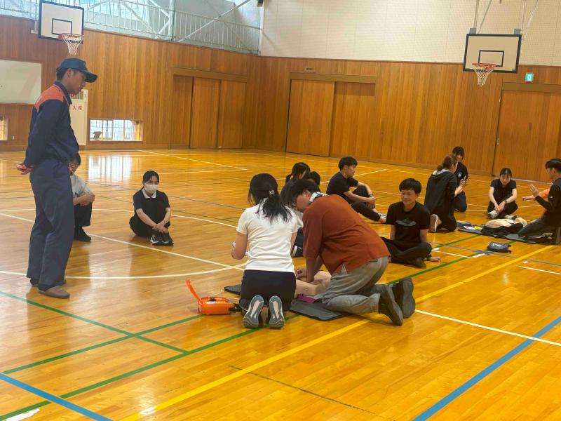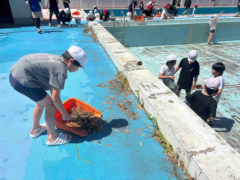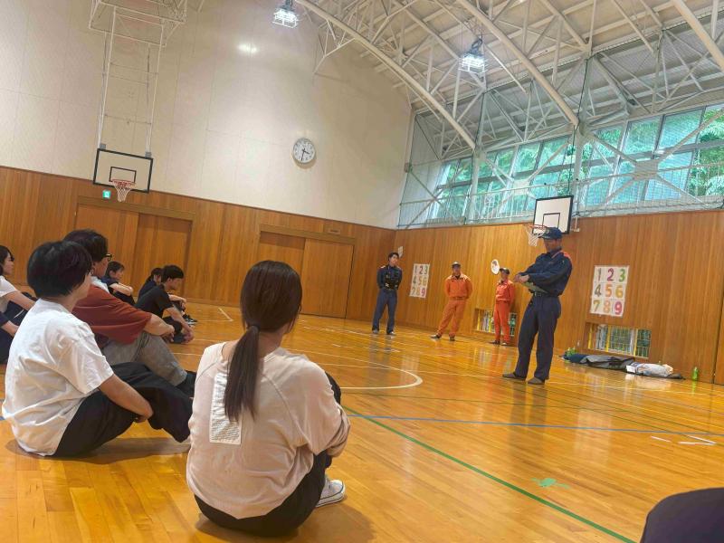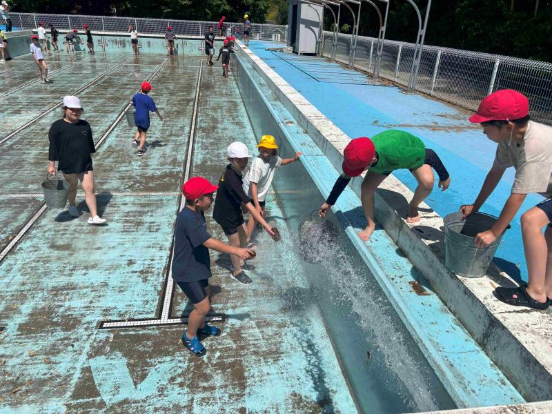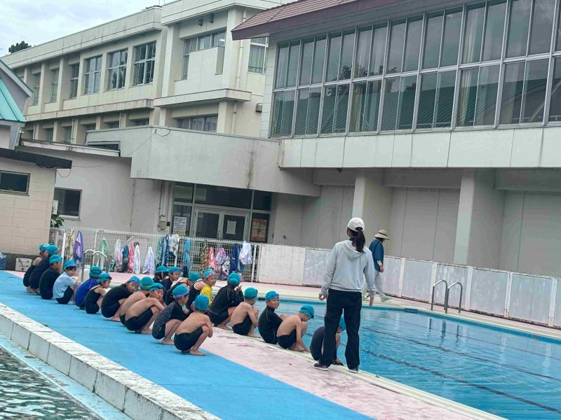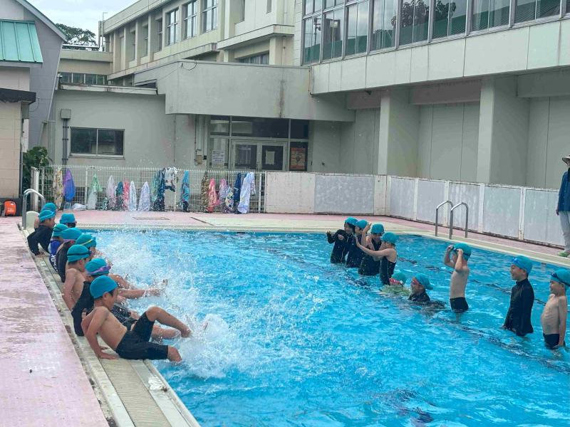 加賀消防本部の方6名に来ていただき、5年生が着泳を体験しました。合言葉は、「浮いて待つ」。「自分の命を守るために真剣にやってほしい」という消防の方からの言葉通り、一生懸命に取り組むことができました。服を着ている状態の動きにくさや重さを十分に体感し、水の危険性を肌で感じたようです。また、もしものときのために、背浮きのコツをつかんだようです。
