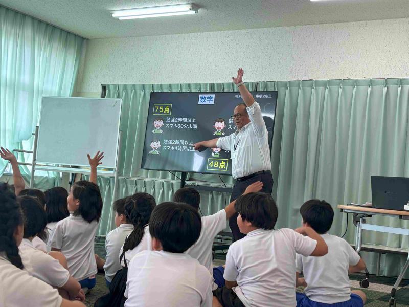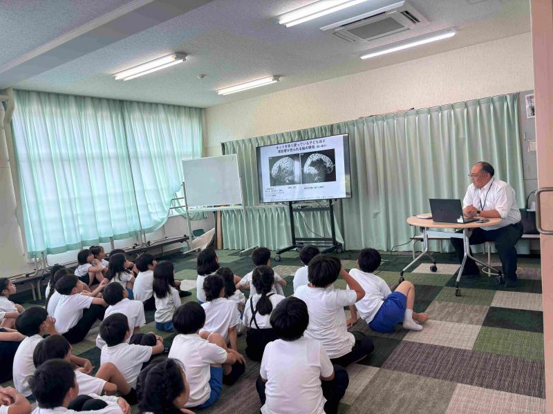 学校三師を招いて5年生の児童・保護者とともに睡眠の大切さについて考える機会を持ちました。保健委員会児童によるアンケート結果の発表、睡眠の必要性についての講話やクイズ、学校三師の方からのお話を通して、親子で学ぶことができました。