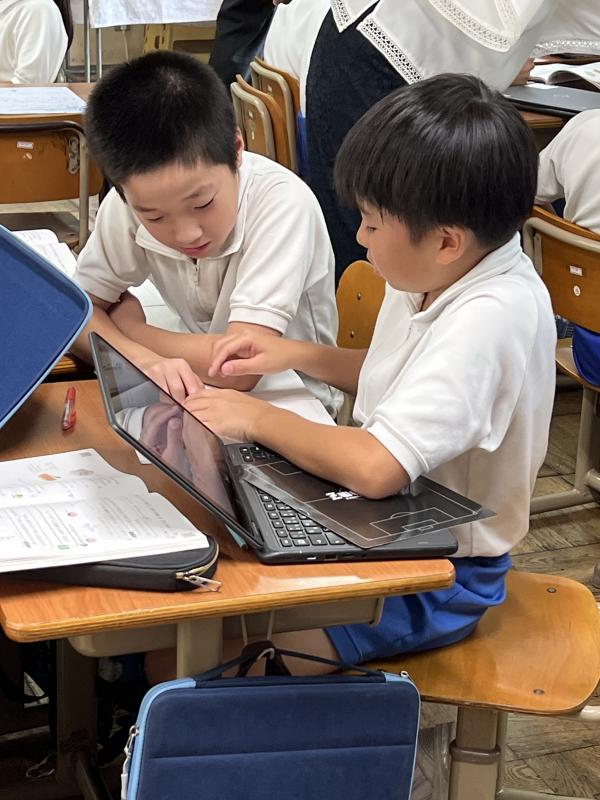 6年生は、表現を工夫し俳句をつくる授業。生成AIにより、自分がつくった俳句にぴったりの背景が表示されると、それをもとに更に一ひねり。思いのこもった素敵な俳句ができました。お互いの作品をタブレット上で自由に見合って感想を伝え合ったり、参考にし合ったり・・・。授業には、タブレットが欠かせないものになっています。まさに文房具として使っている6年生です。