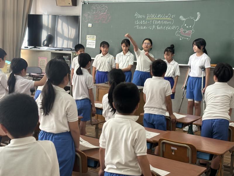 9月28日の運動会に向けての応援練習が始まりました。各学年の1組は赤団、2組は白団として頑張ります。6年生が各クラスに行って、応援の仕方を教えてくれています。当日の応援合戦が楽しみですね。自分たちの力で、教える楽しさや大変さを日々学んでいるようです。