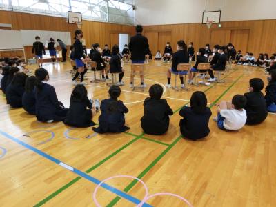 6年生が全体で話し合っています。4年生が周りをぐるーっと囲んで,見学しています。