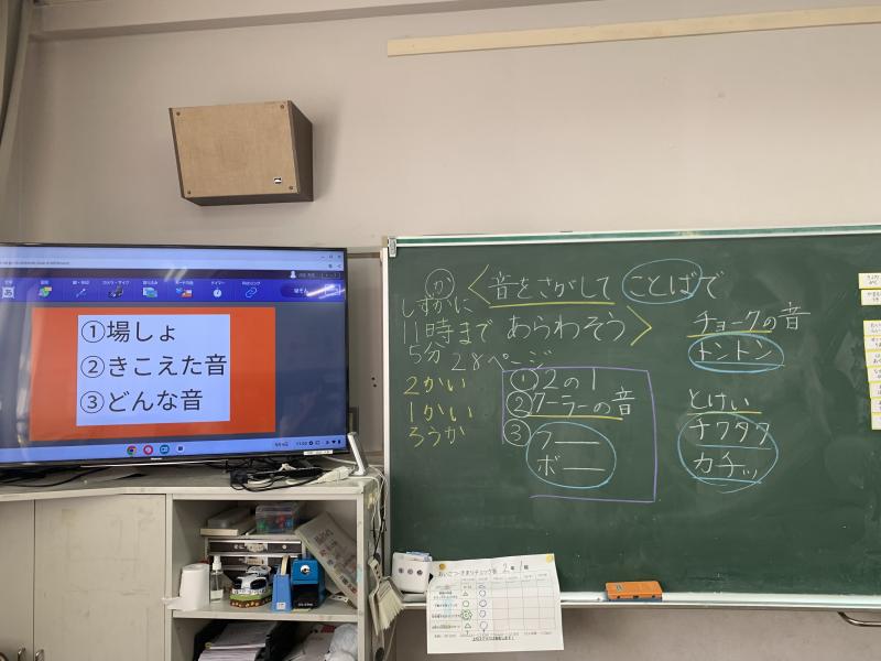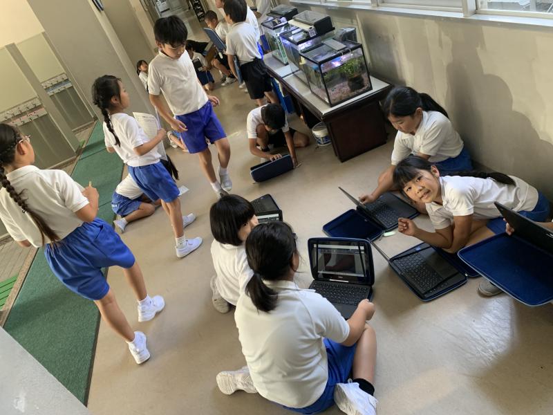 校長室の前がにぎやかだな~と思ったら、2年生が音探しの学習をしていました。楽しい音楽の授業のようです。大好きな癒しのメダカの水槽の前で、いろんな音を見つけていました。タブレットを使っての学習にも慣れてきたようです。