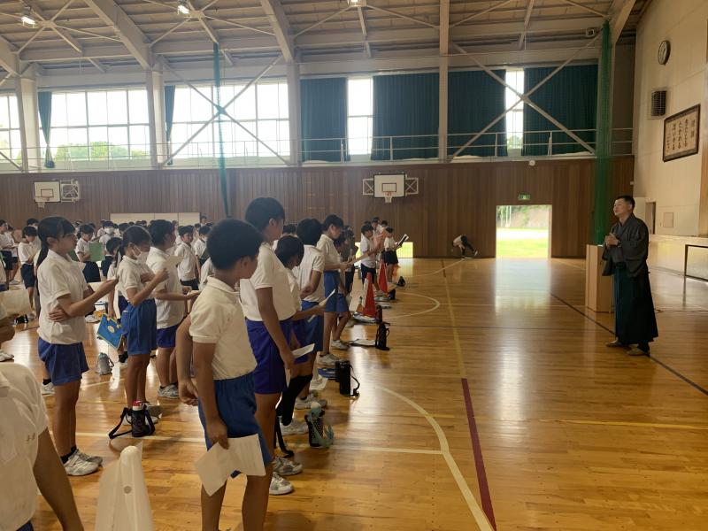 この秋石川県で開催される国民文化祭に関連して、加賀市では、10月10日、小学5・6年生約1000人が集まり、「羽衣」の謡を披露します。それに向けて、動橋・分校・作見の児童が集まり、金沢能楽会の佐野弘宜先生から、直接ご指導いただきました。