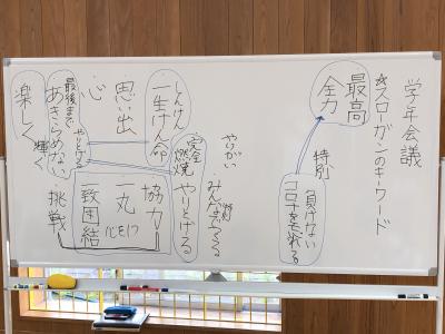 今回は,新型コロナウイルス感染症の影響で通常の運動会ができない中でも,最高の体育発表会(仮称)をつくり上げるために,体育発表会(仮称)への一人一人の思いを出し合って,スローガンに託そうと話し合ったようです。それぞれの思いをキーワードにして出し合い,どうスローガンにまとめるかと話し合っていました。彼らの思いがどのようにスローガンに集約されるのか楽しみです。