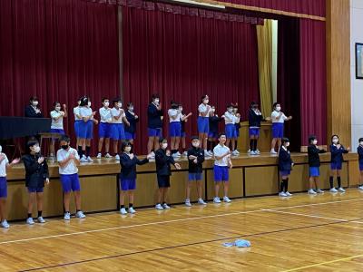 3曲の歌と演奏が終わっても,まだ時間があったので,1年生も知っている歌「虫の声」を披露しました。その後,1年生も一緒に歌いました。