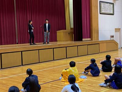 体を動かし,ウォーミングアップ。まずは,国語の授業で勉強した『ニャーゴ』の紙芝居。自分たちで描いた紙芝居をおうちの方に見てもらいながら,とても上手に文章を読んでいました。読み方に抑揚を付け,声色も変えて読むので,紙芝居の世界に引き込まれるようでした。