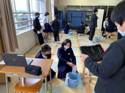 1年生を招いて,水拭きの仕方,床の掃き方,黒板の消し方を披露しました。実演はうまくいったのですが,どんな言葉を使ったら1年生にわかってもらえるのか,声の大きさはどれくらいがいいのか,どの位置から見せてあげると1年生がわかりやすいのか・・・というようなことに最初は苦労していたようです。でも,自分たちで声を掛け合いながら,工夫していました。