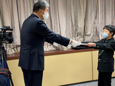 夏休みの科学研究の優秀な作品に対して,『本川弘一科学奨励賞』が贈られ,小学生2人,中学生1人が受賞しました。本校の5年男子も受賞しました。
