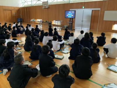 昨日(12月17日(木)),加賀市中央図書館の『図書館いってみ隊 出張版』のお楽しみ企画で,司書の先生に来ていただき,1年生と2年生(1クラスずつ参加)のために『ブックトーク』*をしていただきました。(*『ブックトーク』:あるテーマにそって,何冊かのさまざまなジャンルの本を順序だてて紹介すること)